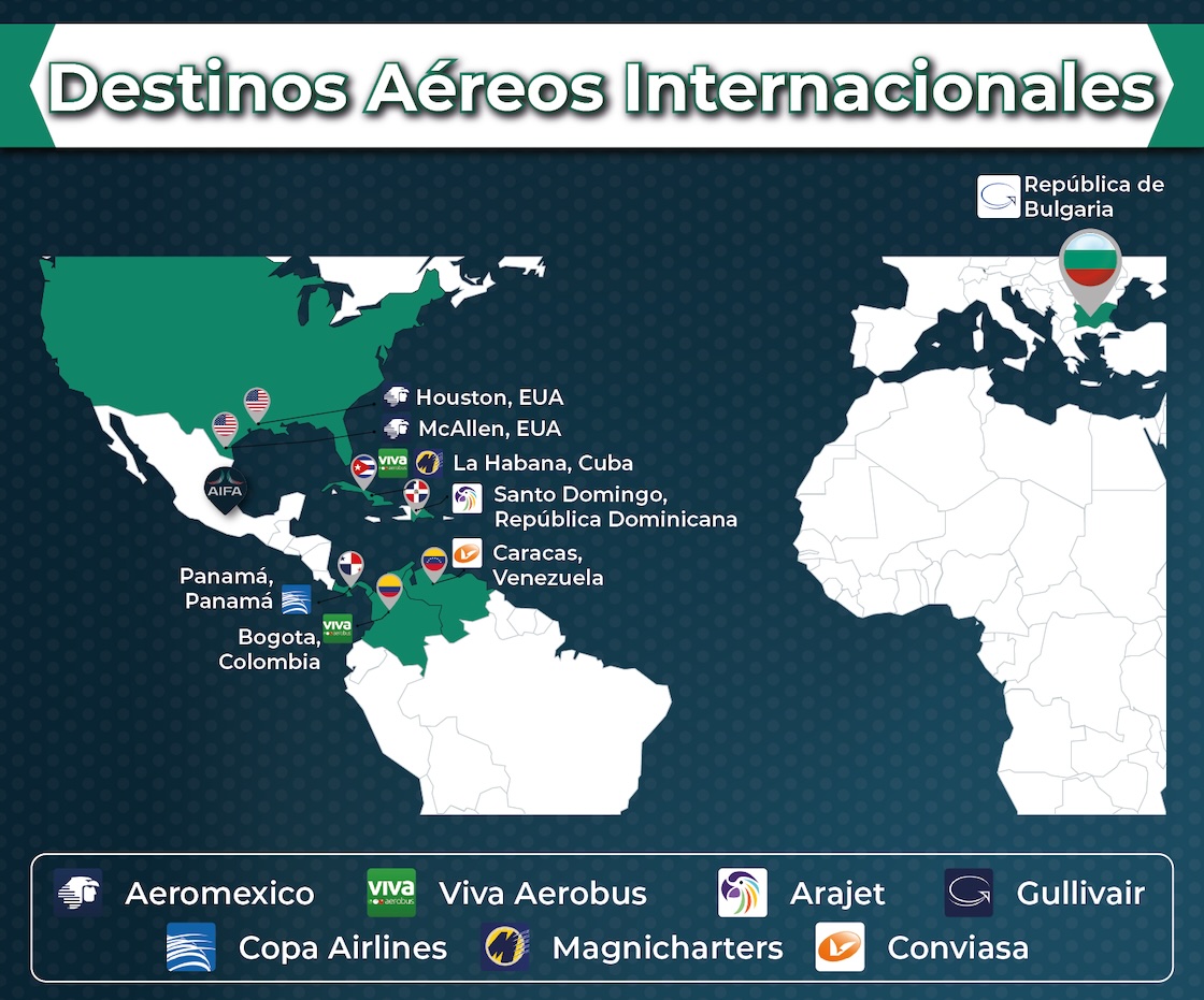 El AIFA todavía no levanta vuelo en cuanto a los destinos internacionales. Hasta septiembre de 2024 maneja destinos como Houston y McAllen en Estados Unidos.