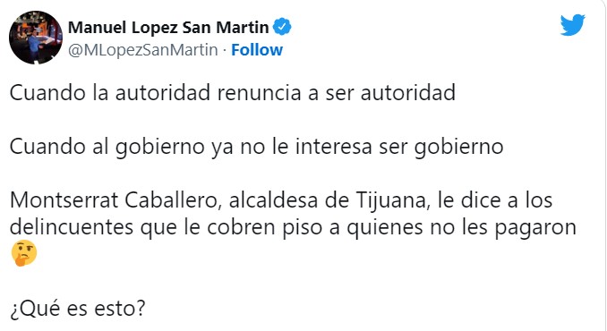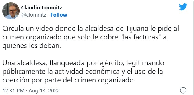 Pero reiteramos, el problema fue lo que dijo dirigiéndose a los grupos criminales. La alcaldesa de Tijuana dio a entender que no hay problema con que cobren “facturas” a quienes les deben, pero que nomás no se metan con gente inocente porque entonces sí hay un problema.