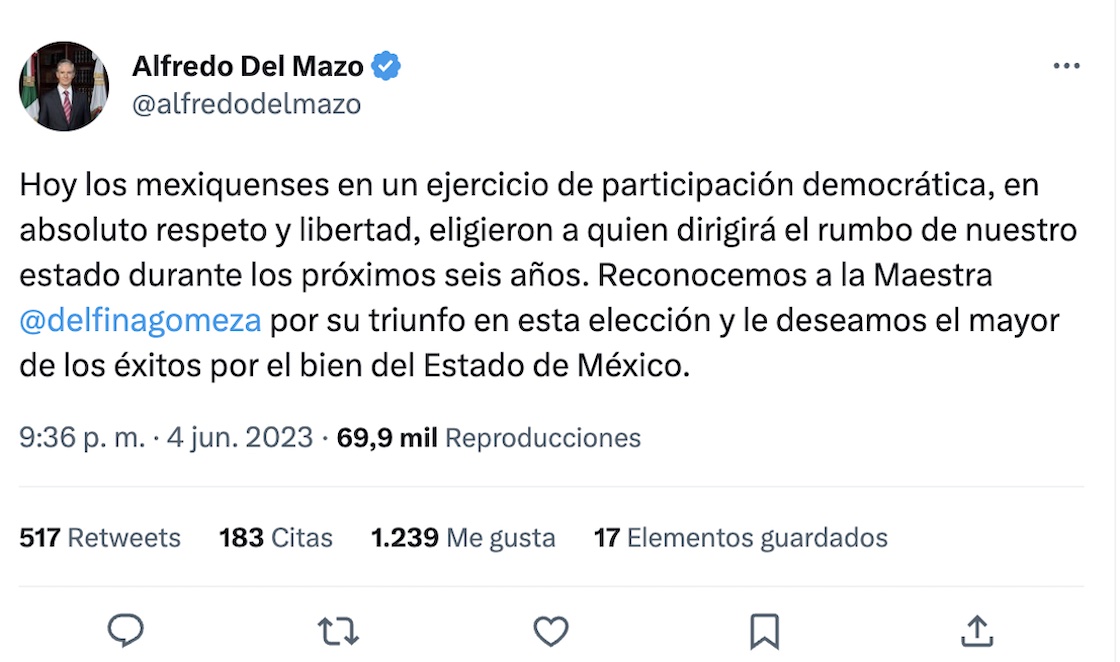 Y por si estaban con el pendiente, el aún gobernador del Estado de México Alfredo Del Mazo también reconoció el triunfo de Delfina Gómez —estimado por el Conteo Rápido y que veremos cómo terminará con el famoso PREP.¿Qué dijo Del Mazo?