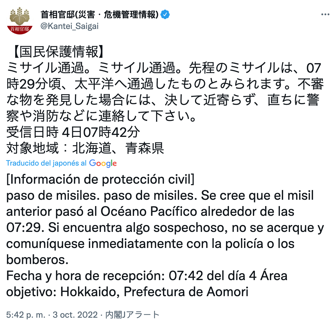 Por medio de sus redes sociales, la Oficina del Primer Ministro japonés, Fumio Kishida, advirtió sobre el lanzamiento de un misil por parte de Corea del Norte. A pesar de que en un inicio el gobierno alertaba de incluso un área de destino del misil en tierra, poco después anunciaron que el misil solo sobrevoló el territorio y cayó en el Océano Pacífico.