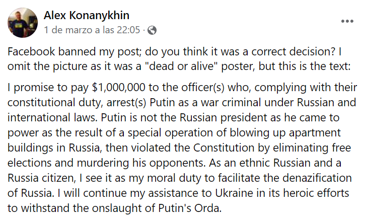 “Prometo pagar 1.000.000 de dólares al funcionario o funcionarios que, cumpliendo con su deber constitucional, detengan a Putin como criminal de guerra según las leyes rusas e internacionales“, dice. “…considero que es mi deber moral facilitar la desnazificación de Rusia. Seguiré ayudando a Ucrania en sus heroicos esfuerzos por resistir la embestida de la horda de Putin“.