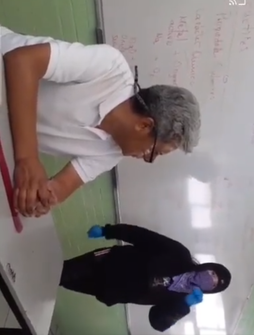 El profesor aparece en el video sentado en su escritorio, mientras la joven lo acusa frente a sus compañeras en un salón de la Voca 8.