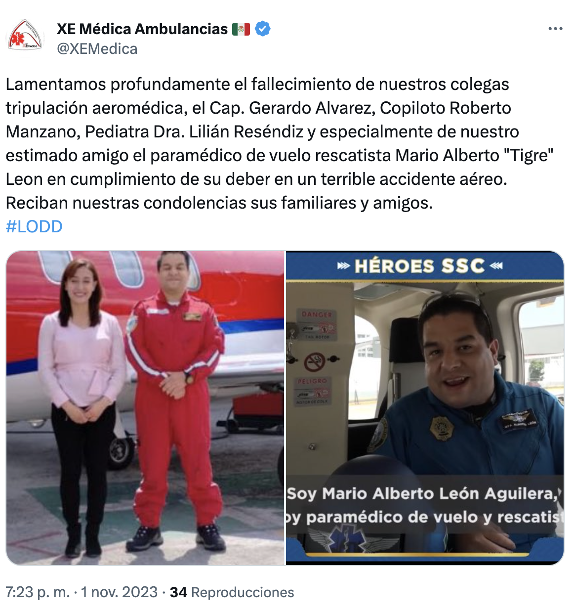 Por medio de sus redes sociales, el servicio privado de emergencias, XE Médica Ambulancias, lamentó el fallecimiento de los 4 tripulantes de la aeronave que se accidentó en Morelos.