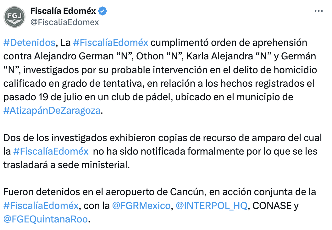 En un breve comunicado, la Fiscalía del Estado de México informó que arrestaron al hombre conocido como Lord Pádel, así como su esposa, su hijo y el socio de sus empresas deportivas. Fueron identificados como Alejandro Germán “N”, Othon “N”, Karla Alejandra “N” y Germán “N”.
