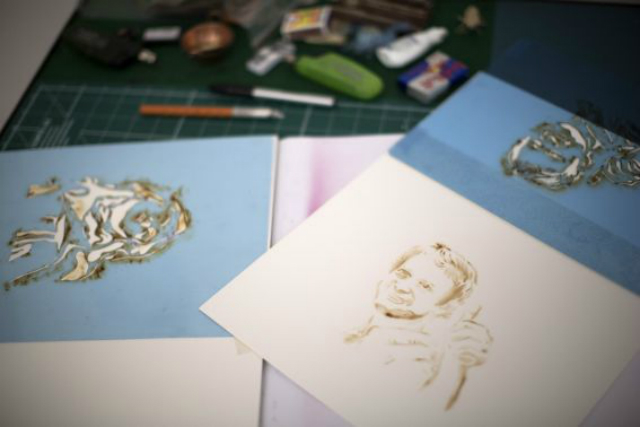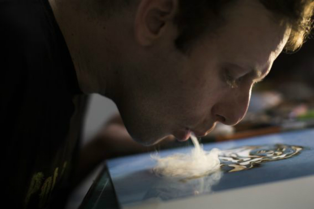 Se preguntaran cómo le hace, acá les explicamos. De la Rocque sopla el humo después de darle una fumada a su cigarro sobre unas plantillas precortadas que están puestas sobre un lienzo blanco, eso para la coloración de la pintura y darle sombreado a las áreas deseadas.