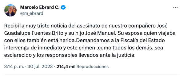 “Demandamos a la Fiscalía del Estado intervenga de inmediato y este crimen, como todos los demás, sea esclarecido y los responsables llevados ante la justicia”, escribió Marcelo Ebrard en su perfil de dicha red social donde lamentó la muerte de Fuentes.