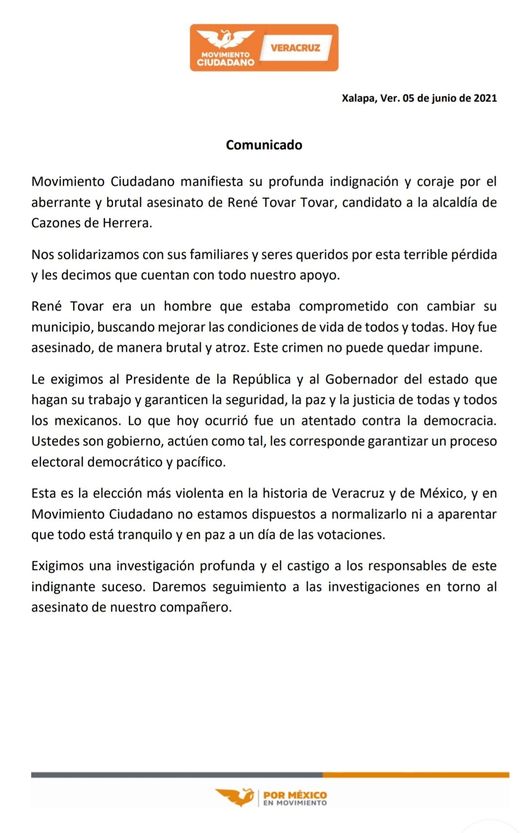 En @MovCiudadanoMX condenamos enérgicamente el cobarde asesinato de René Tovar, candidato a la alcaldía de Cazones de Herrera, Veracruz. Una vez más exigimos al @GobiernoMX @SEGOB_mx que hagan lo que les toca: garantizar la vida y seguridad de los mexicanos de cara a la elección.