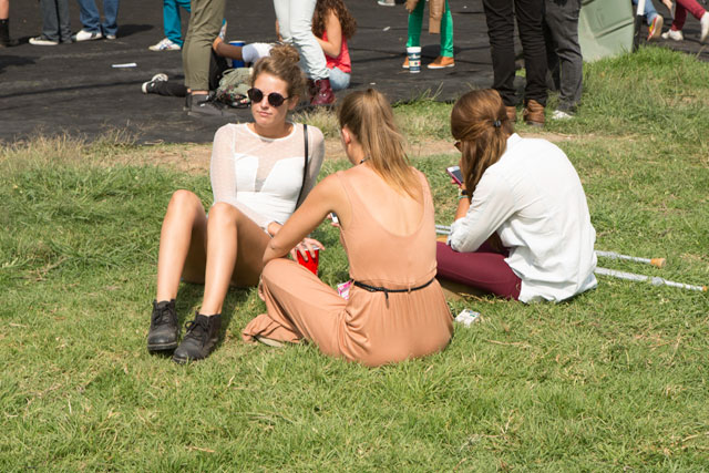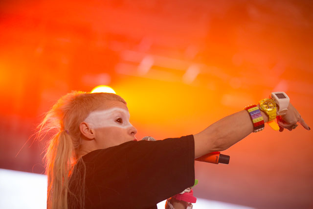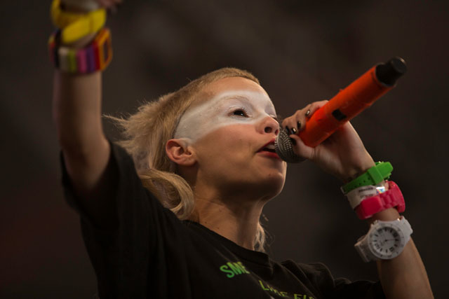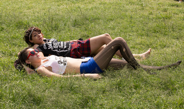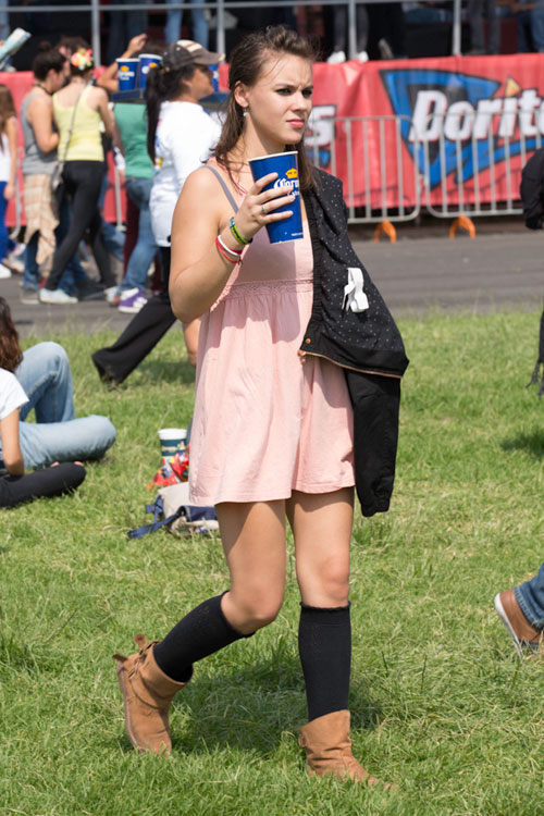 Al poco rato, una de las primeras bandas internacionales, las Dum Dum Girls, pisaron el mismo escenario. El calor mutaba y el público era escaso, Dee Dee apareció en sus clásicas medias a rayas, vestido negro y adornos de encaje sobre los brazos, que le hacían destacar la perfección al ritmo de su dulce voz cantando “He Gets Me High”. Distorsiones y reverb en alta potencia, las hijas de PsychoCandy, oscuras y empapadas de rimel y labial, nos regalaron tracks estupendos del mejor Garage de nuestra época. Como doctrinarias del girly noise, las gafas oscuras no pueden quedar olvidadas, como si protegieran su espíritu detrás de un cristal gótico, rezando por morir antes de envejecer. A sus atuendos oscuros los acompañaban espectros en colores radiantes que figuraban en la pantalla detrás de ellas. El público cantaba y los coros ardían sobre llamaradas de ruido y suciedad, el cover a The Smiths, “There Is A Light That Never Goes Out”, resultó un explosivo calidad nuclear, la gente quería más pero este festival tenia una larga tarde que entregarnos.