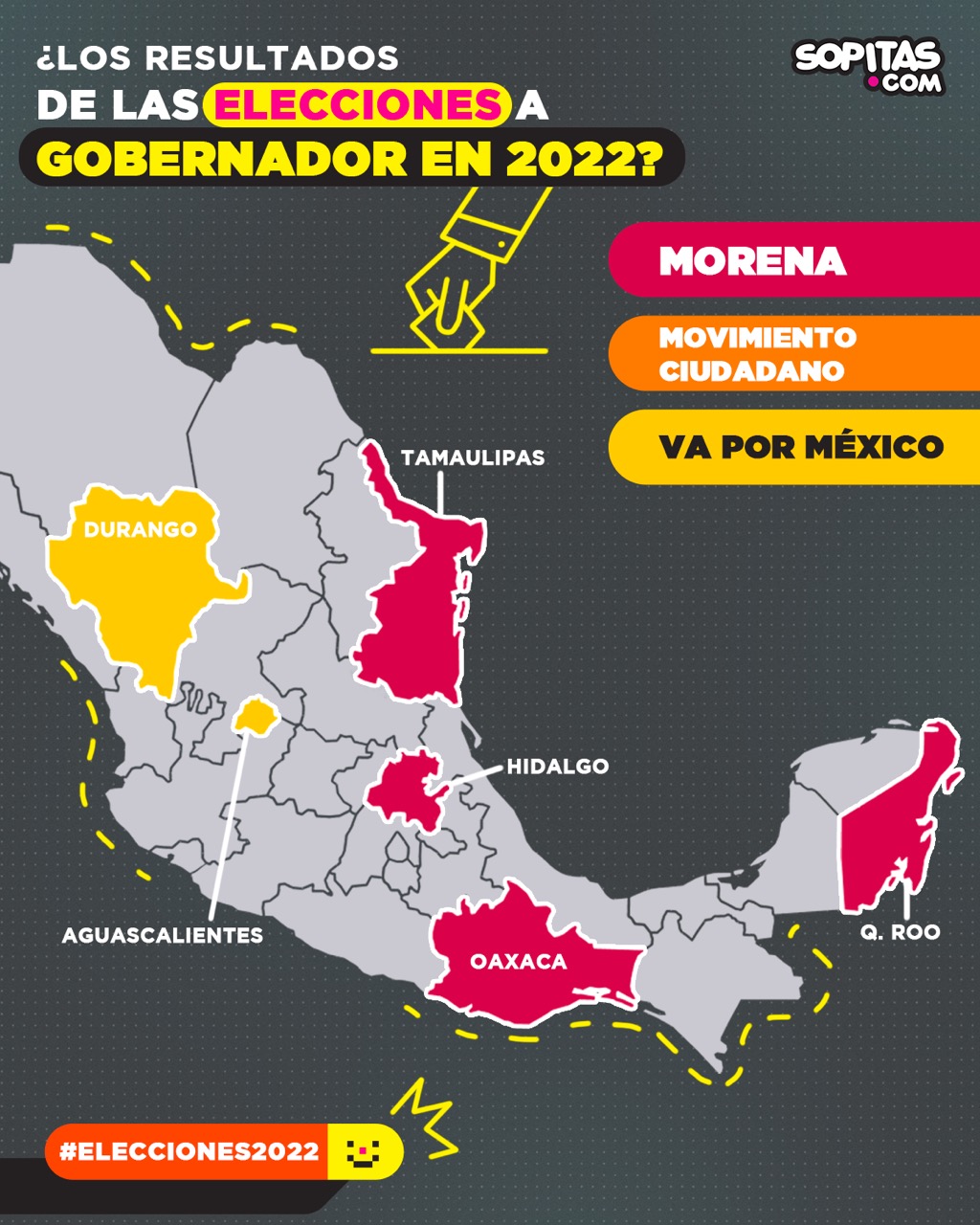 Con la victoria para la alianza de Morena en 4 de los 6 estados en juego, el mapa político electoral en México queda así mero: el partido del color guinda gobernará en un total de 21 estados, el Partido Verde tiene uno, el PRI se queda con 3, Movimiento Ciudadano con 2 y el PAN con 5 estados.