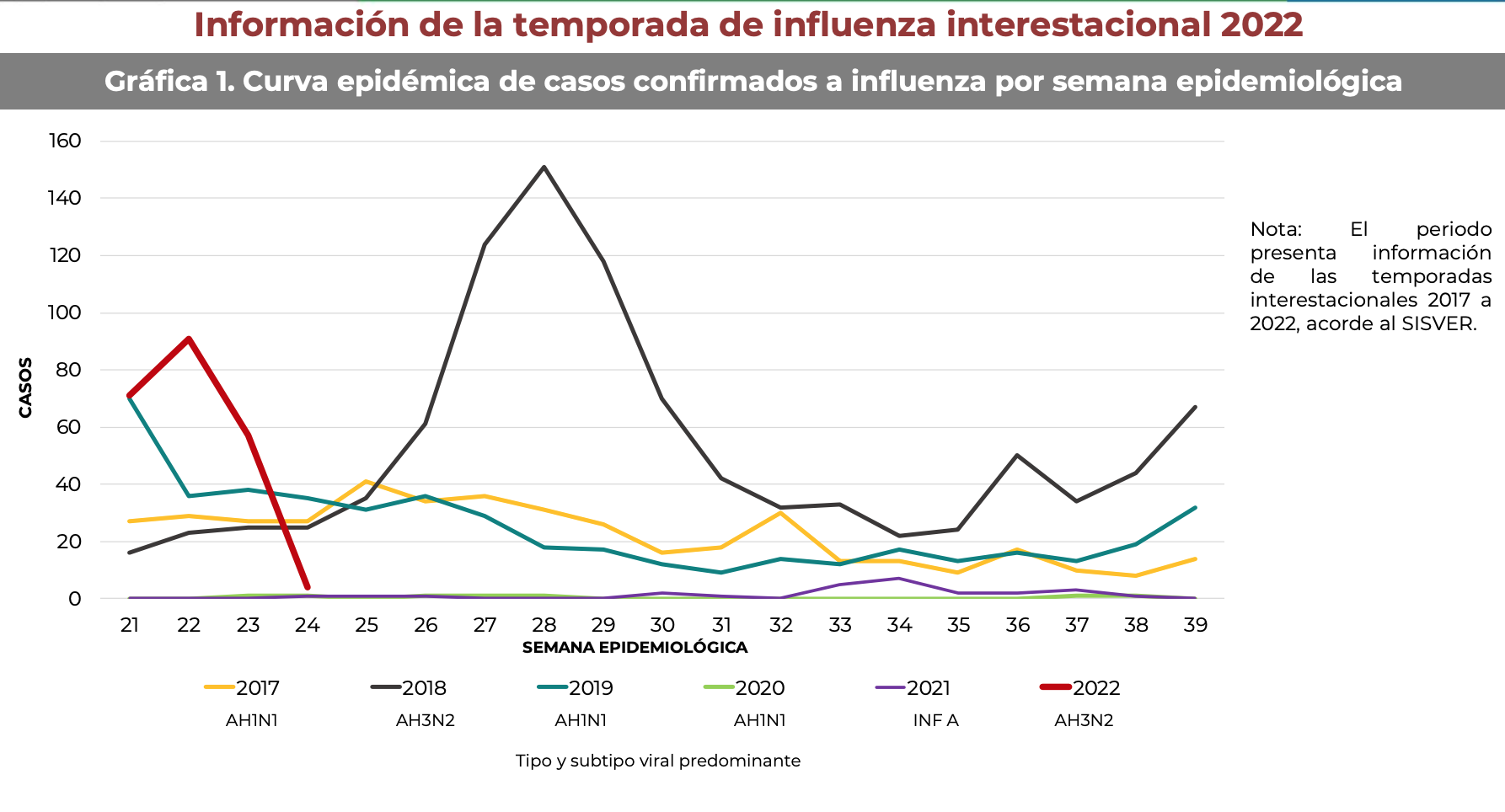 De acuerdo con la información de la Secretaría de Salud, entre la semana epidemiológica 21 y hasta la 24 (la temporada interestacional es de la 21 a la 39 del 2022) se han registrado 223 casos de influenza.