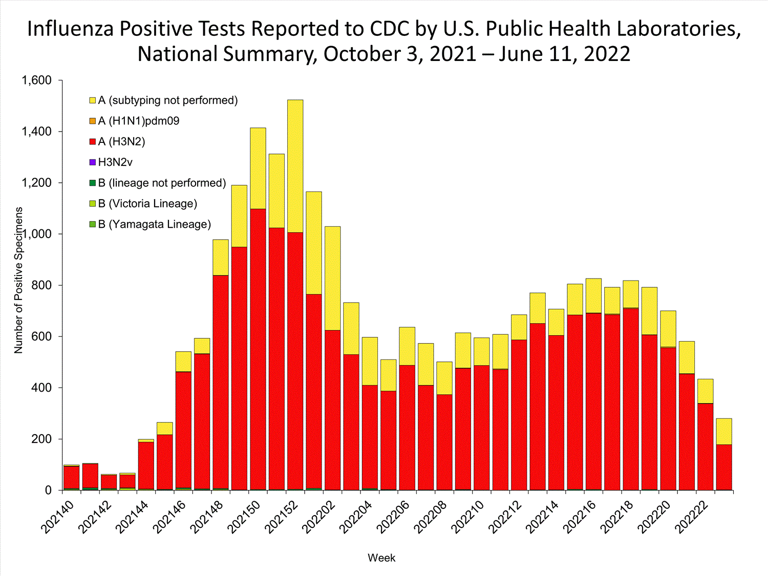 En lo que va de esta temporada interestacional del 2022 se observa un 81.2% de influenza viral AH3N2, un 17.9% de influenza A No Subtipificable y un 0.9% de influenza B.