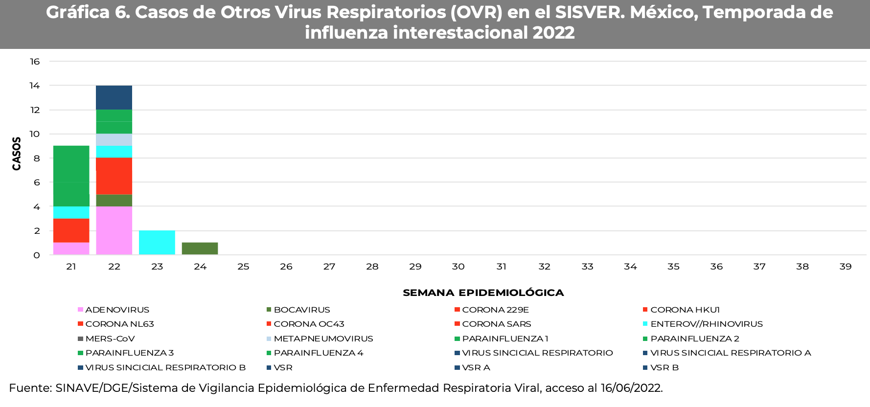 Así es como se ve el monitoreo de otros virus respiratorios en el Sistema de Vigilancia Epidemiológica de Enfermedades Respiratorias (SISVER). Podemos ver, por ejemplo, el predominio de adenovirus en la semana 22.