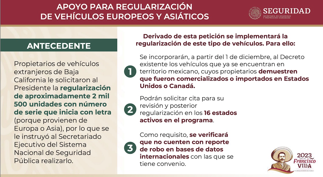 Entonces, esto de la regularización de autos chocolate de Europa y Asia es la respuesta a la petición hecha por gente de Baja California, que busca tener en orden los papeles de sus carros, que fueron comprados o importados en Estados Unidos y Canadá.