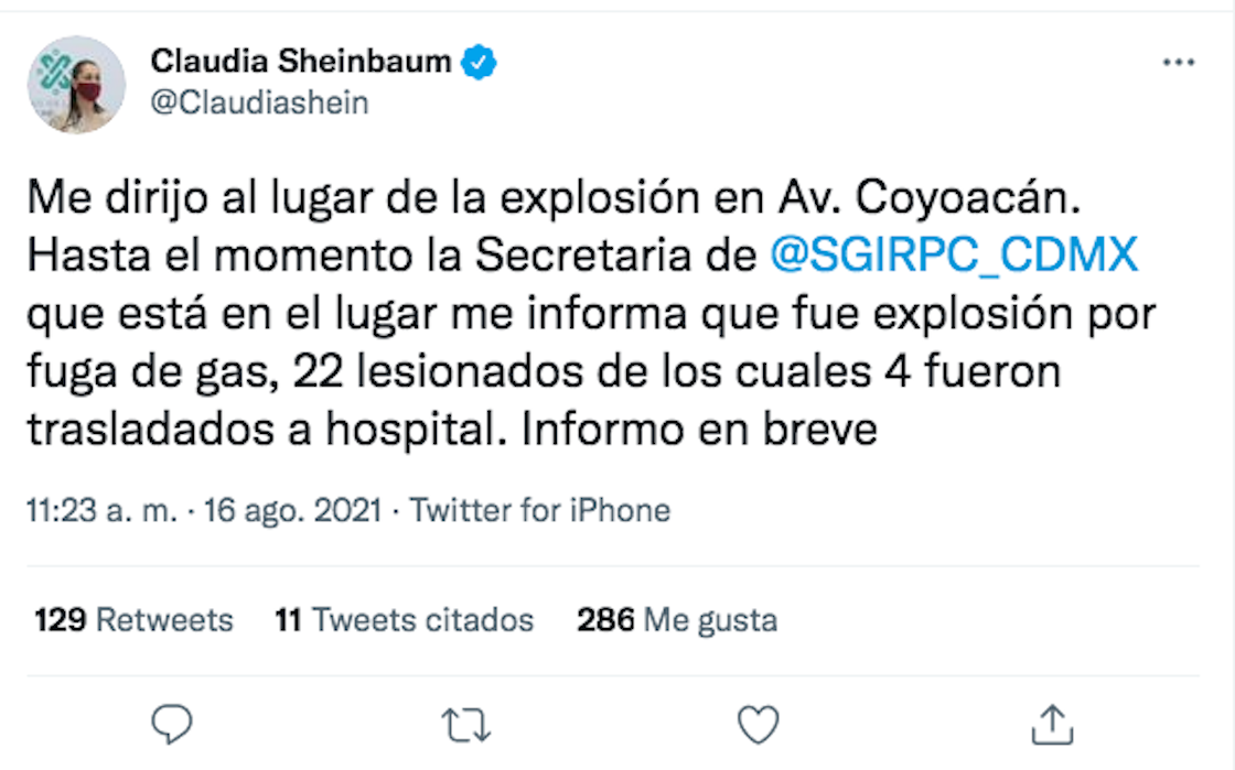 Poco después de las declaraciones del alcalde de Benito Juárez y la secretaria de Gestión Integral y Protección Civil, en su cuenta de Twitter Claudia Sheinbaum avisó que se dirigía hacia Avenida Coyoacán —actualizando la cifra de personas heridas a 22 y cuatro traslados al hospital.