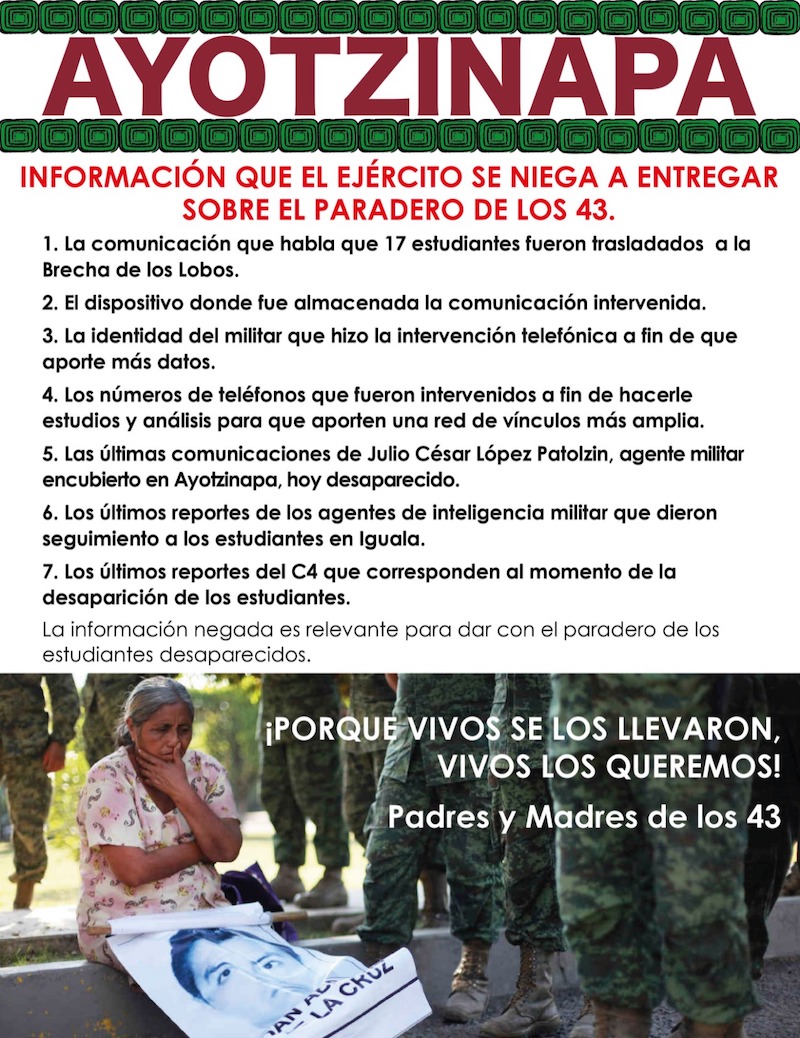 Aunque AMLO ha dicho que la Sedena (Secretaría de Defensa Nacional) ya entregó la información que tiene sobre el caso, las familias demandan al menos 7 puntos relacionados con los reportes de inteligencia militar sobre la detención de los estudiantes y hasta las últimas comunicaciones con el soldado infiltrado, Julio César López.