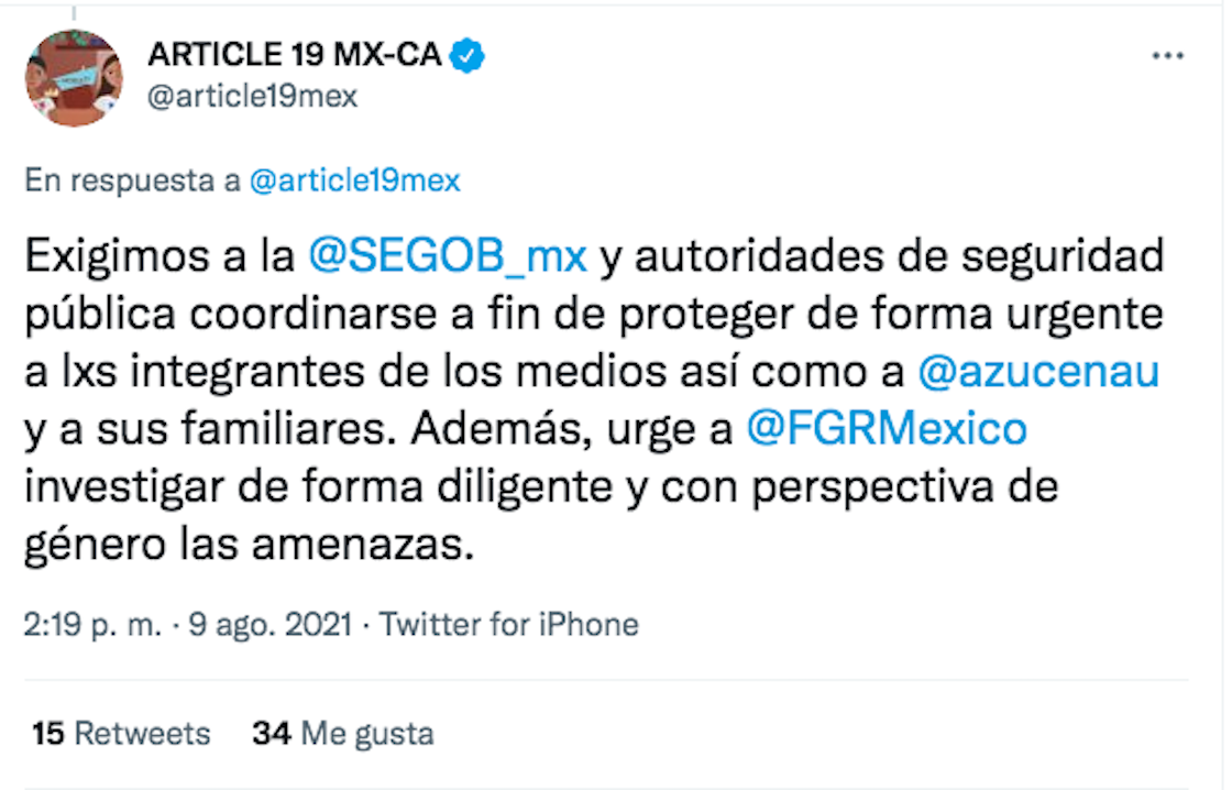 Sin embargo, este mensaje —un tuit— no ha sido suficiente y hoy organizaciones como ARTICLE 19 piden la intervención de la FGR (Fiscalía General de la República) y, claro, de la Secretaría de Gobernación (Segob).