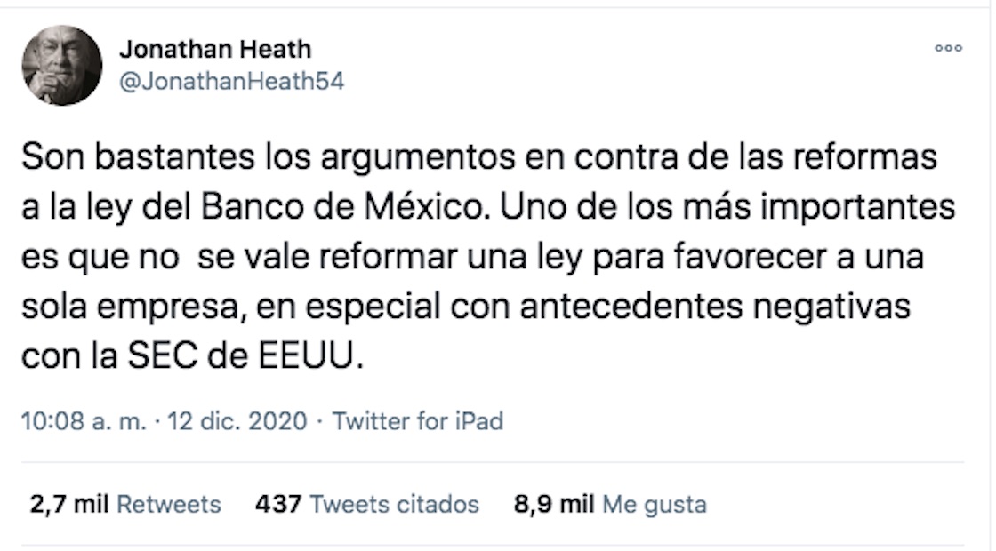 El subgobernador del Banxico Jonathan Heath lo señaló así: “No se vale reformar una ley para favorecer a una sola empresa, en especial con antecedentes negativos”.