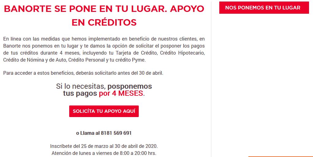 Ante la contingencia sanitaria por el coronavirus COVID-19 y ante las medidas implementadas por la Secretaría de Salud, Banorte postergará por 4 meses los pagos de: