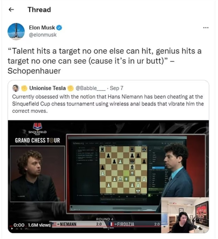 Todo comenzó cuando el jugador estadounidense Hikaru Nakamura acusó a Niemann de hacer trampas. No estamos seguros de dónde pero surgió el rumor de que Niemann podría haber usado bolas anales para hacer trampa.