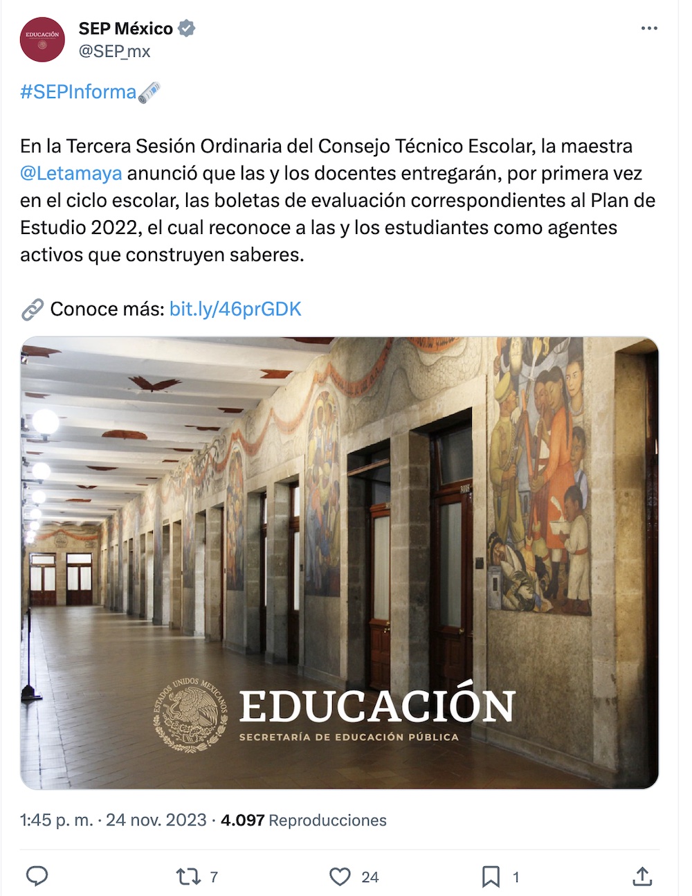 La SEP recordó que se trata de la primera tanda de calificaciones que se entregarán bajo el nuevo Plan de Estudio 2022 —en el que más allá de los exámenes, se reconoce a los/las estudiantes en la práctica social, familia, escuela y comunidad.
