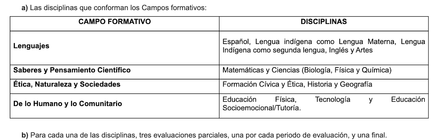 En la fase 6, que ya es secundaria, las boletas deben tener las disciplinas de los campos formativos o bueno, lo que antes se llamaban como materias. Y ya. Aquí un ejemplo de estos campos:
