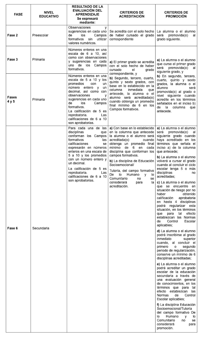 En las fases 4 y 5 de primaria las calificaciones aprobatorias también serán de 6 a 10, pero en las boletas ya se podrá agregar el 5, que es reprobatorio. Lo mismo en la fase 6. Aquí la tablita de la SEP sobre la evaluación: