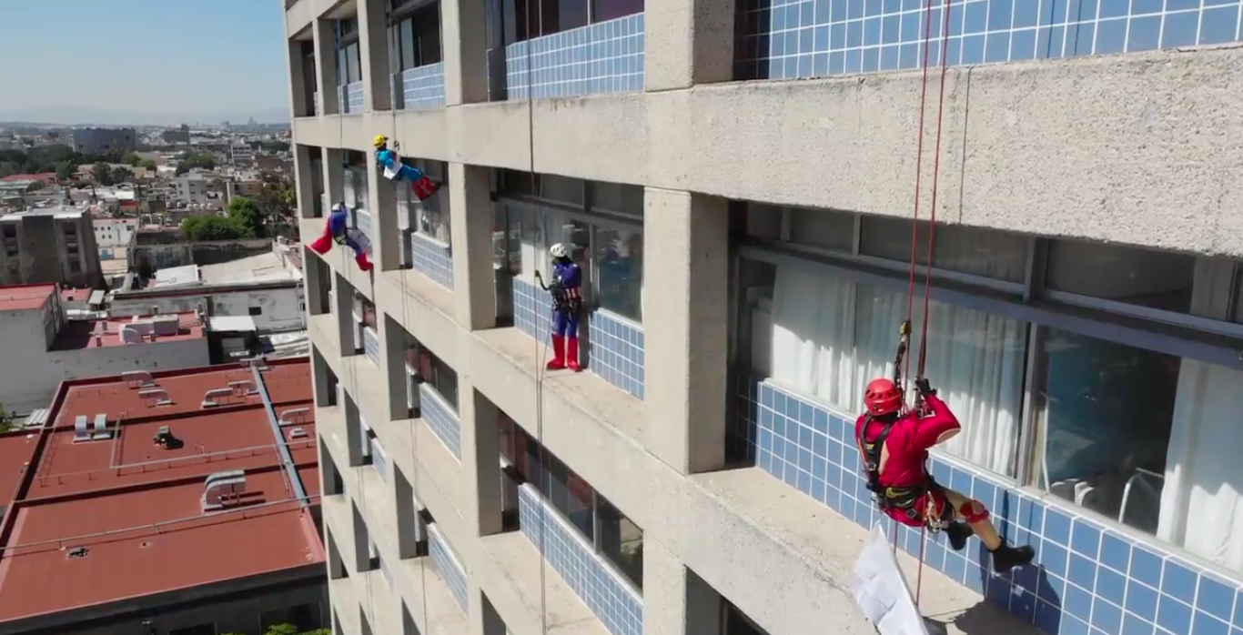 Por medio de un video compartido en sus redes sociales, elementos de Protección Civil y Bomberos de Guadalajara mostraron el momento en que descendieron a rappel del edificio defendiéndose en cada piso para saludar a los niños.