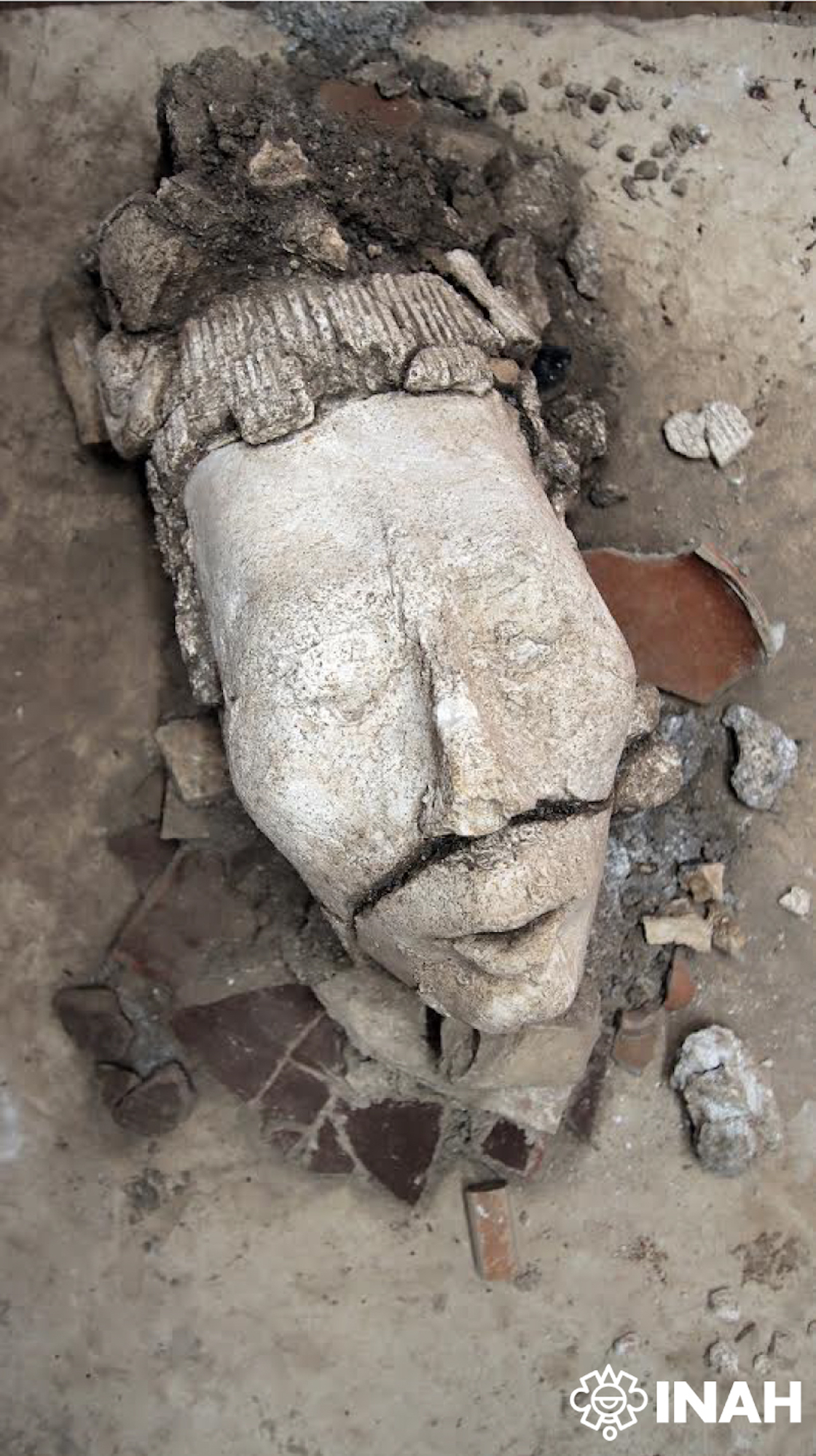 Al escarbar un poquito más, hallaron la nariz y boca semiabierta de la deidad maya. Ya al descubrirla por completo, también se dieron cuenta que la escultura servía como eje de una ofrenda que se colocó en un estanque de piso y paredes estucadas, “para emular el ingreso de este dios al inframundo, en un entorno acuático”.