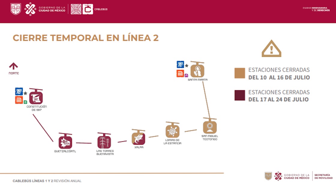A partir de este próximo domingo 17 de julio cerrarán la Línea 2 del Cablebús de la CDMX por trabajos de mantenimiento y acá te damos todas las fechas en las que suspenderán el servicio en dos tramos de estaciones.