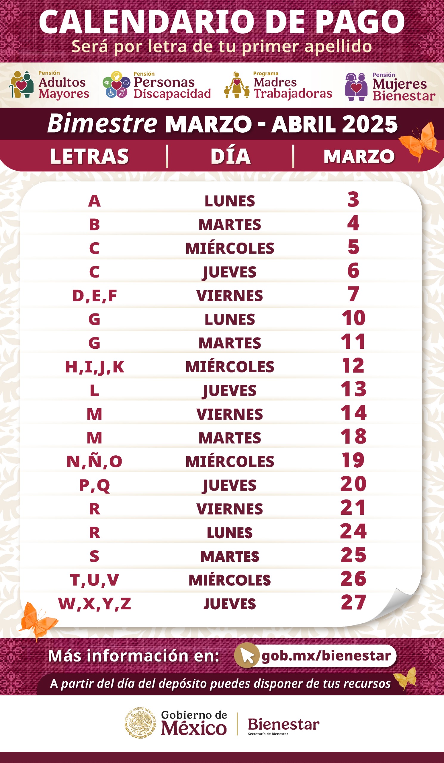 Adultos mayores, personas con discapacidad, madres trabajadoras y mujeres con bienestar cobrarán de acuerdo a la primera letra de su apellido