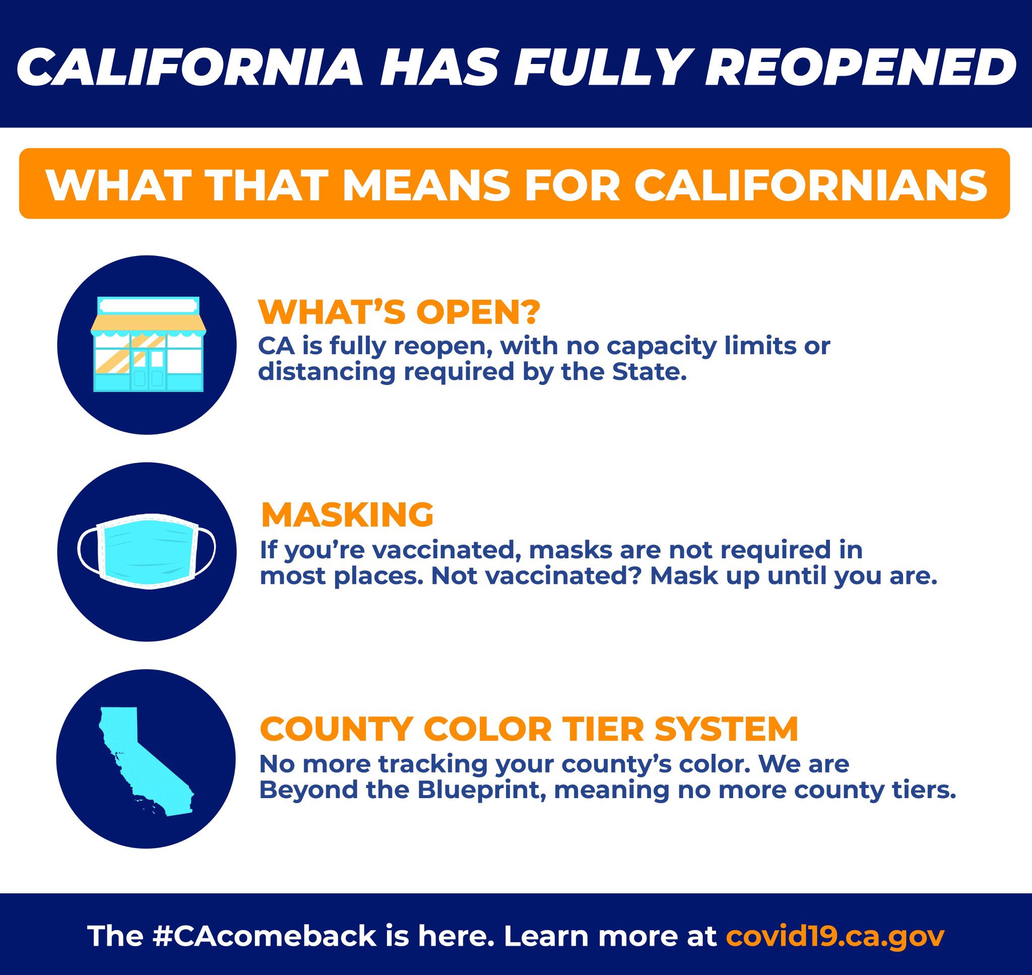 Algo así como el (casi) fin de la pandemia: Con 40 millones de vacunas aplicadas y uno de los índices de contagio más bajos en Estados Unidos, California anuncia que regresa a la normalidad y que todos los espacios están abiertos al 100%.