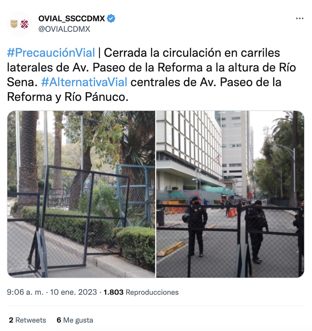 En cuanto a Reforma, a las 9 de la mañana de este 10 de enero, el Centro de Orientación informó del cierre de los carriles laterales a la altura de Río Sena (cerca de la Embajada de Estados Unidos en México), por lo que recomendó tomar los centrales o Río Pánuco.