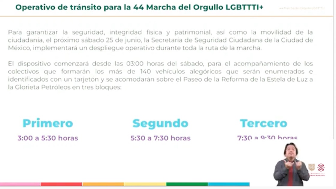 La SSC CDMX realizará un operativo desde las 3 de la madrugada del sábado 25 de junio para acompañar la llegada de los carros alegóricos que participarán en esta edición de la Marcha del Orgullo LGBT+.