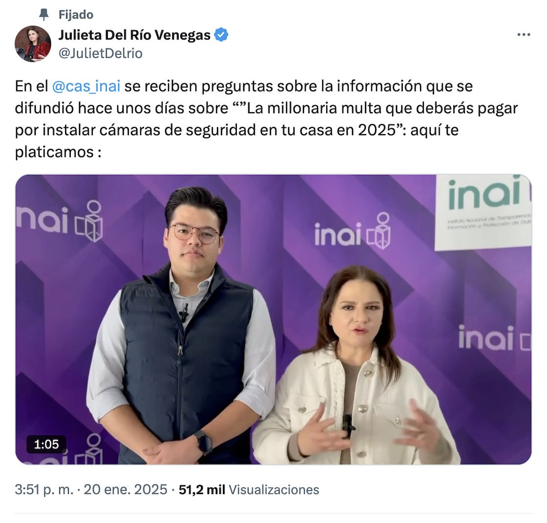 “Hemos recibido varias llamadas al centro de atención a la sociedad, aquí en el INAI, respecto a una información que se generó hace algunos días donde se decía que si tenías cámaras de seguridad en tu casa podrías ser acreedor a una multa (…) primero decirte que el único facultado para interpretar esta ley es el INAI”.