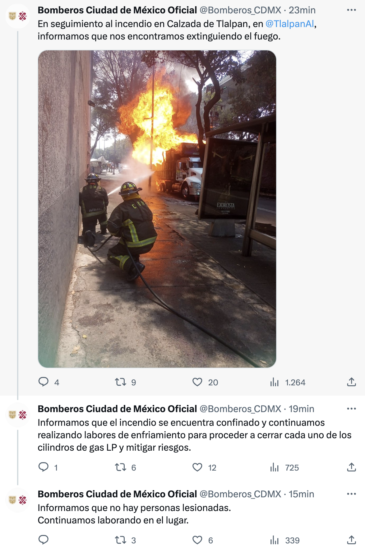 Por medio de sus redes sociales, los bomberos de la Ciudad de México avisaron sobre el incendio de un camión que transportaba cilindros de gas LP sobre Calzada de Tlalpan y Periférico Sur, en la alcaldía Tlalpan, en los límites con Coyoacán.