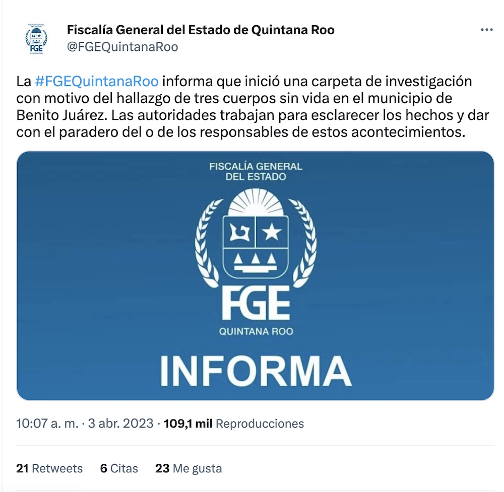 “La Fiscalía de Quintana Roo informa que inició una carpeta de investigación con motivo del hallazgo de 3 cuerpos sin vida en el municipio de Benito Juárez. Las autoridades trabajan para esclarecer los hechos y dar con el paradero del o de los responsables”.