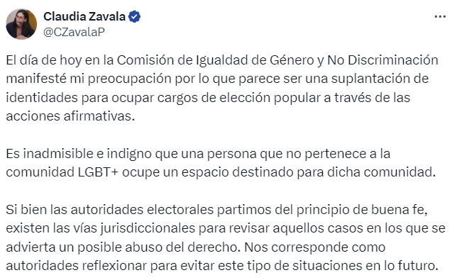 “El día de hoy en la Comisión de Igualdad de Género y No Discriminación, manifesté mi preocupación por lo que parece ser una suplantación de identidades para ocupar cargos de elección popular. Es inadmisible e indigno que una persona que no pertenece a la comunidad LGBT+ ocupe un espacio destinado para dicha comunidad“.