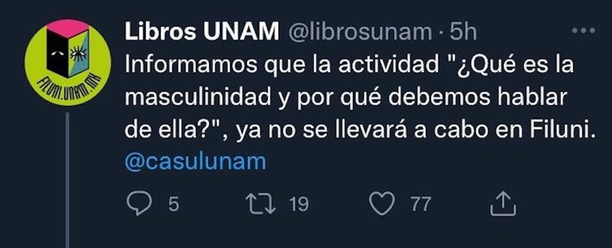 Y antes de avanzar, va un poco de contexto: la UNAM canceló el foro ‘¿Qué es la masculinidad y por qué debemos hablar de ella?’ en la Feria Internacional del Libro (Filuni) —que contaba con la participación de Itzel H. Suárez, una de las panelistas en El Aquellarre.