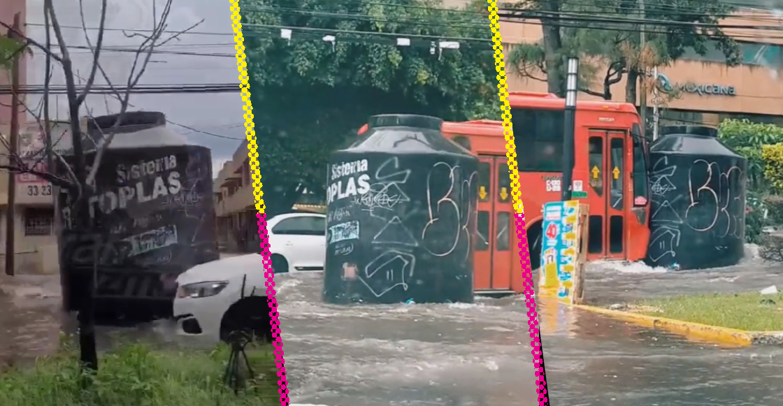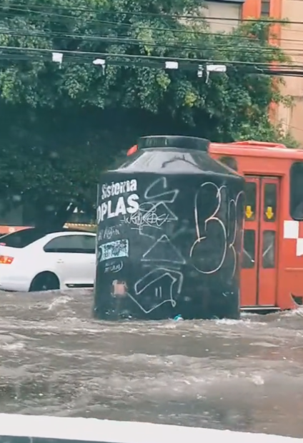 Un par de videos exhibieron la surrealista escena que se dio este 19 de agosto en la capital de Jalisco. El enorme tinaco pasó con toda libertad junto a algunos autos gracias a la corriente, al grado de llegar a chocar con un autobús.