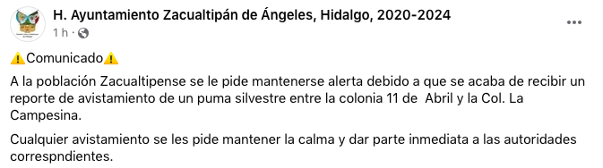 Sobre este video y por medio de sus redes sociales, el ayuntamiento de Zacualtipán pidió a la población mantenerse alerta ante el reporte del alistamiento de un puma silvestre.