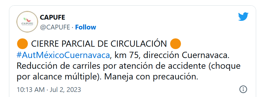 “Cierre parcial de circulación, Autopista México-Cuernavaca, km 75, dirección Cuernavaca. Reducción de carriles por atención de accidente (choque por alcance múltiple). Maneja con precaución”, fue el mensaje de Caminos y Puentes Federales a través de redes sociales sobre este accidente.