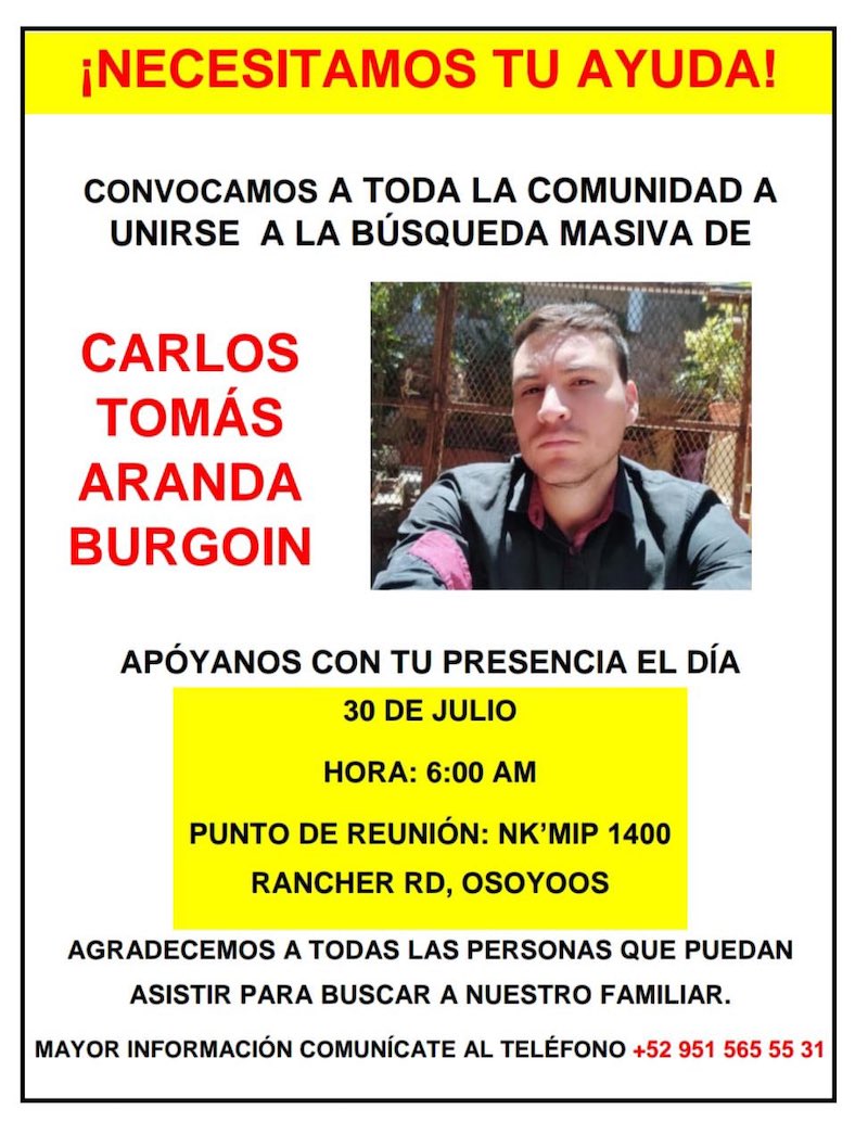 Carlos Tomás Aranda Burgoin desapareció el 7 de julio en Osoyoos, Canadá. Su familia ha pedido el apoyo del gobierno de AMLO para localizarlo, en otro caso de desaparición de mexicanos en el extranjero.