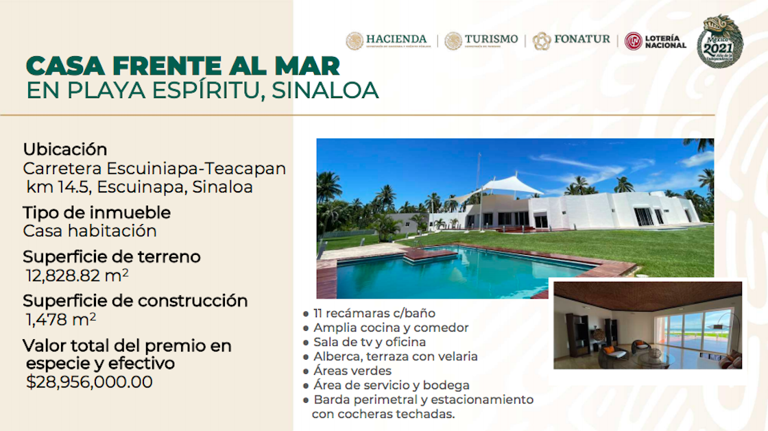 Según las autoridades, la casa frente al mar que se rifará en el próximo gran sorteo de la Lotería Nacional se encuentra en Playa Espíritu, Sinaloa, más o menos a la altura del kilómetro 14.5 de la carretera Escuiniapa-Teacapan. Además, indicaron que el terreno donde se encuentra tiene una superficie de 12 mil 828.82 metros cuadrados, mientras que la casa tiene mil 478 metros cuadrados.