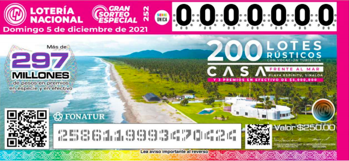 Y en su clásica conferencia mañanera, el tabasqueño dio a conocer el segundo Gran Sorteo Especial 252 que llevará a cabo la Lotería Nacional el próximo 5 de diciembre de 2021, con el cual se rifará una casa y 200 terrenos rústicos frente al mar de Sinaloa.