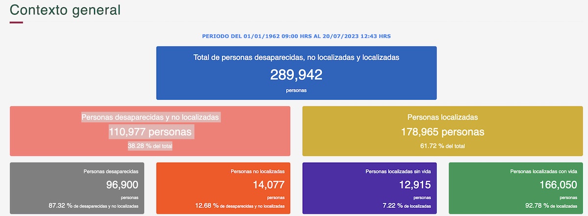 De acuerdo con el mismo el Registro Nacional de Personas Desaparecidas y No Localizadas (RNPDNO), en México hay 110 mil 977 personas personas desaparecidas y no localizadas.