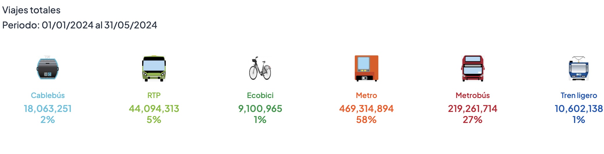 De enero a mayo de 2024 el Metro de CDMX registró 469 millones 314 mil 894 viajes totales. El 58% de todos los viajes en transporte público en Ciudad de México.