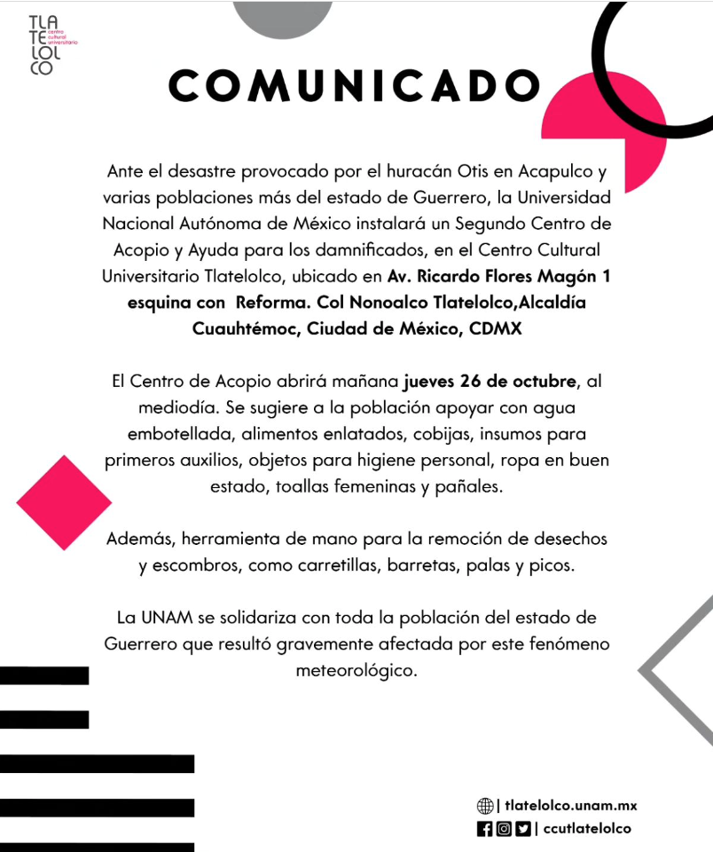 También, la UNAM anunció que instalarán un segundo centro de acopio en el Centro Cultural Universitario Tlatelolco, CDMX. Estará abierto desde el jueves 26 de octubre a las 12pm.