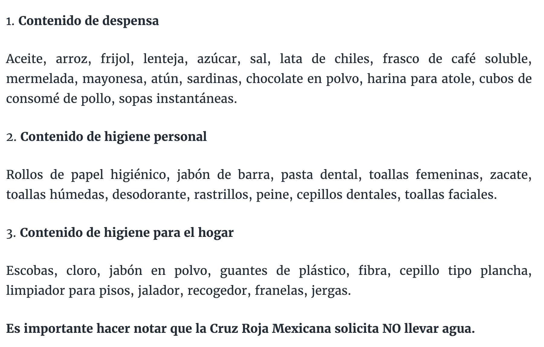 Por lo pronto, la Cruz Roja Mexicana pide como donaciones para despensa productos como: aceite, arroz, frijol, lenteja, azúcar, sal, lata de chiles, frasco de café soluble, mermelada, atún, chocolate en polvo, consomé de pollo y sopas.