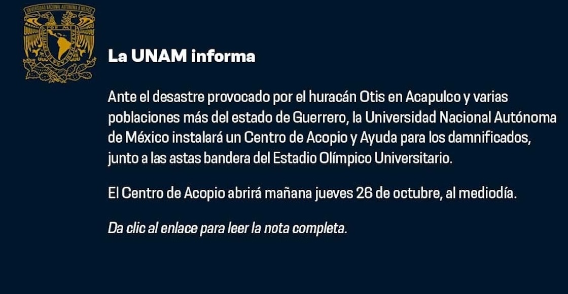 A partir del jueves 26 de octubre, la UNAM instalará un centro de acopio y ayuda para las personas damnificadas, por el huracán Otis, en el estacionamiento 8 del Estadio Olímpico—ubicado en Avenida Insurgentes Sur S/N en la alcaldía Coyoacán. En un principio se había planteado que sería en la zona de astas pero lo movieron para las personas que quieran llegar en carro y no afectar el tránsito.
