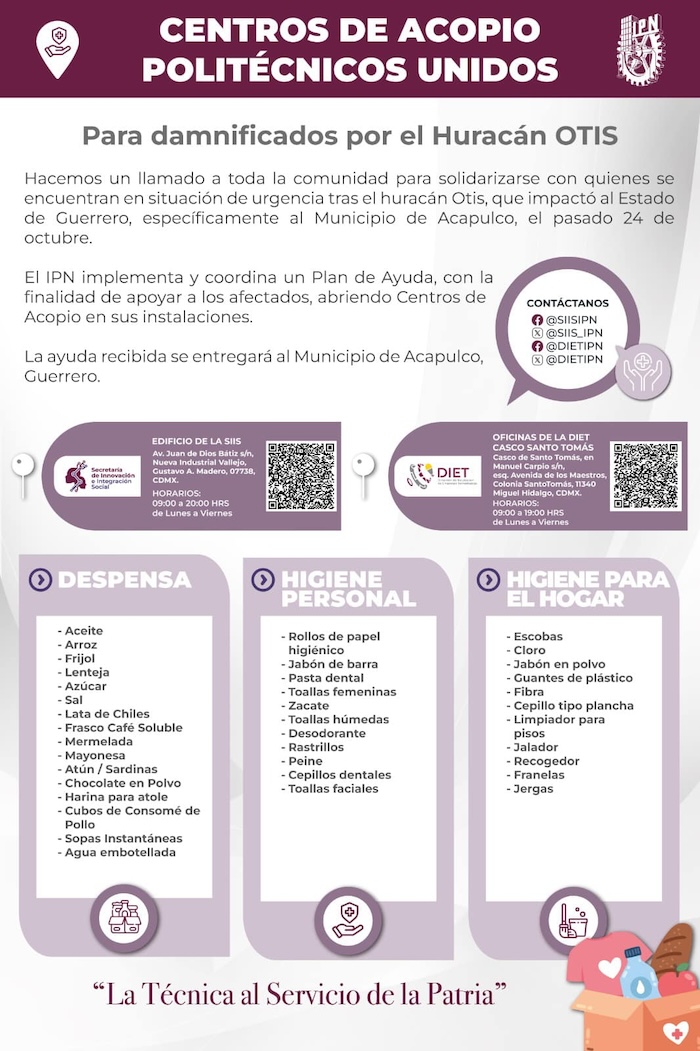 Al igual que la UNAM, el IPN abrió dos centros de acopio para ayudar a las personas damnificadas por el huracán Otis.